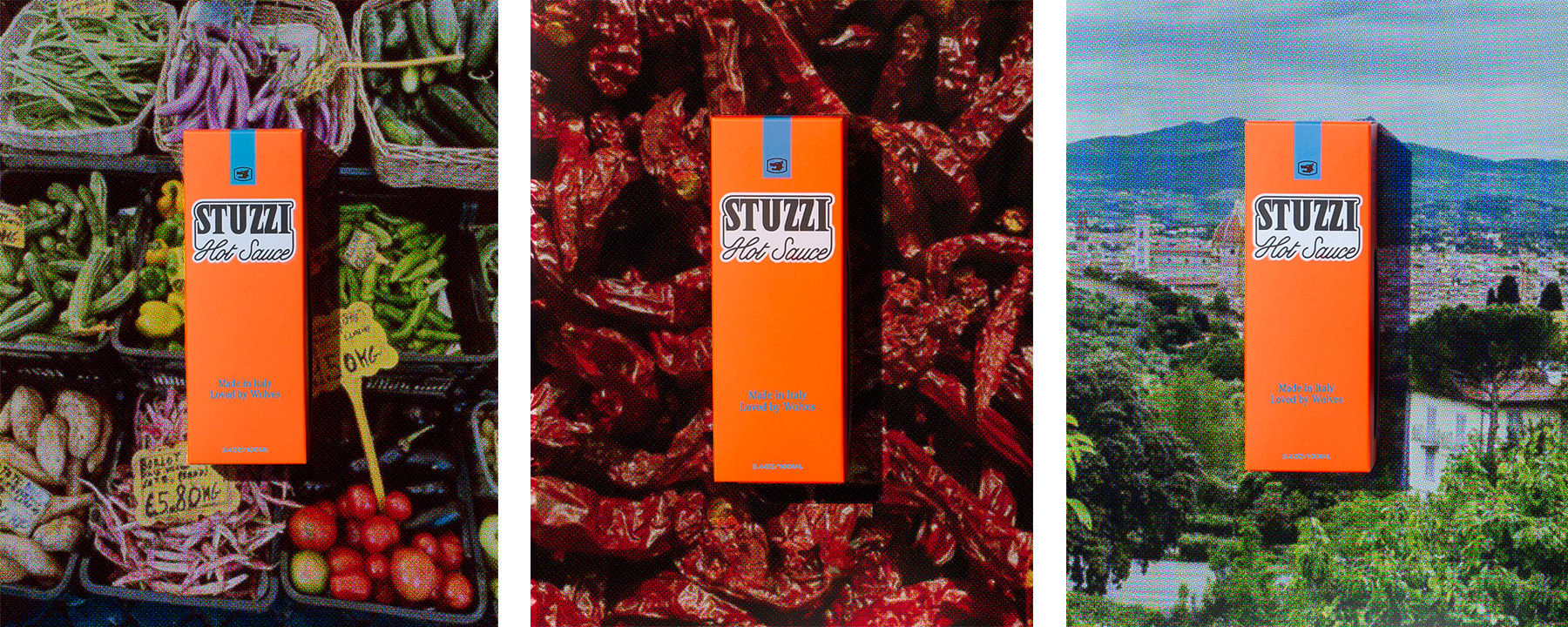 Stuzzi is a high-end hot sauce that is informed by modern luxury and classic Italian sensibilities. For the launch of their brand and digital presence, we needed to create a collection of images, merch, and social posts that showed off the bottle, the world it lives in, and the traditional roots that ground Stuzzi's commitment to quality.